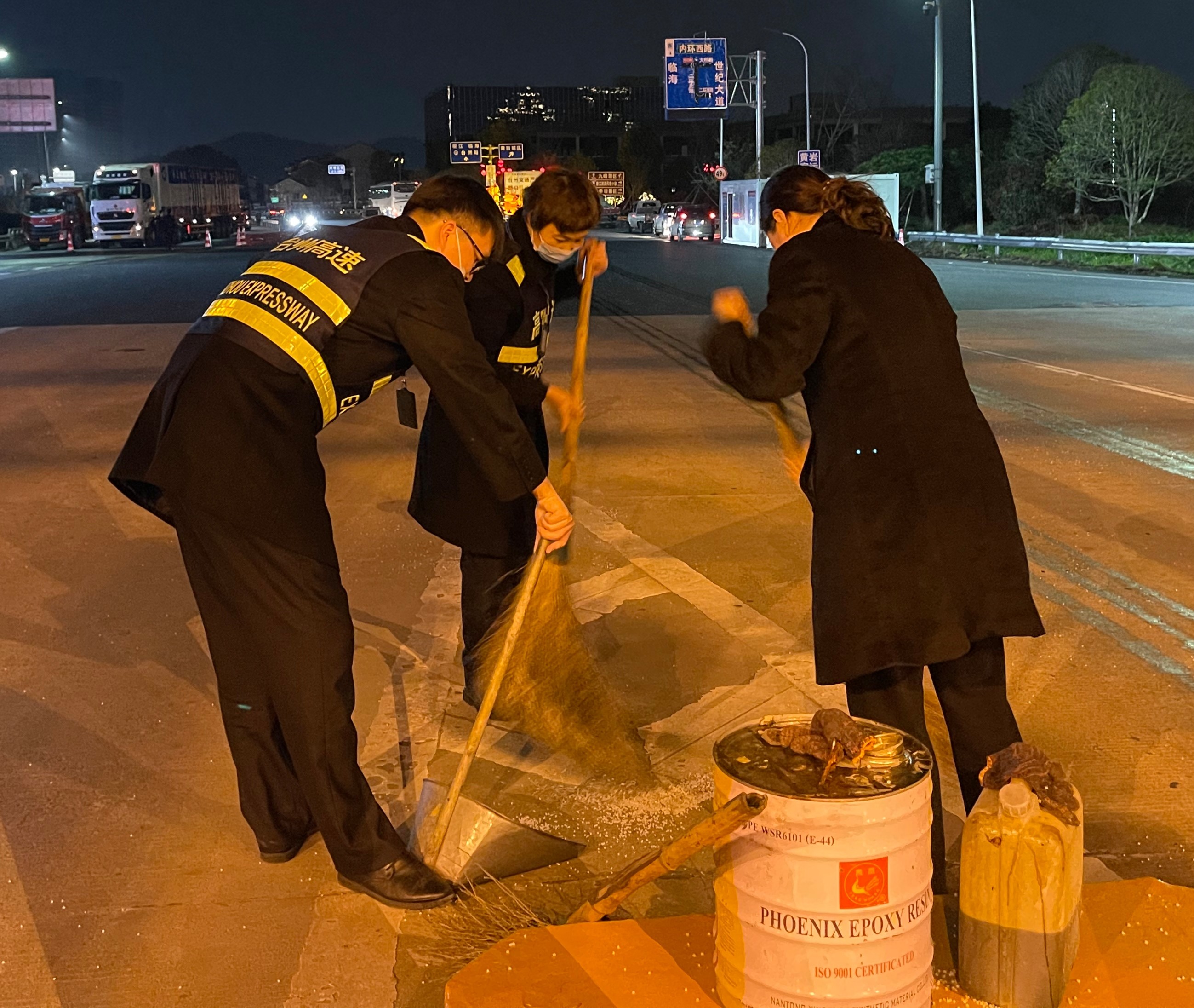 (圖為工作人員在清掃) 一時(shí)之間,車道路面上落滿大量的塑料顆粒,考慮到夜色已深,ETC車道上行駛的車輛速度大多很快,萬(wàn)一司機(jī)沒有及時(shí)發(fā)現(xiàn)前方道路上的灑落物,極易造成輪胎打滑,嚴(yán)重影響行車安全。情況緊急,為了后續(xù)通行車輛的安全,收費(fèi)班長(zhǎng)立刻關(guān)閉了該ETC車道,并放置警示標(biāo)志,然后將這一情況上報(bào)給監(jiān)控中心和收費(fèi)所值班人員。不等清潔人員到來(lái),收費(fèi)員羅時(shí)杰從車道的工具房拿出掃帚和簸箕,主動(dòng)開始清掃工作。隨后其他不坐崗的收費(fèi)員也投入到了清掃工作中,這支臨時(shí)清掃小隊(duì)在沒有任何人的領(lǐng)導(dǎo)下自發(fā)地組織起來(lái)。這時(shí),從高速上完成機(jī)電養(yǎng)護(hù)工作的機(jī)電班工作人員正巧路過(guò),他們看到這一幕立刻將車停靠在一邊,加入清掃隊(duì)伍。盡管散落的塑料顆粒數(shù)量較多,但在大家的共同努力下,車道終于被清理干凈,恢復(fù)了正常通車。 春日的夜晚微風(fēng)拂過(guò),已有春的暖意,而更暖的是這一幕在春夜里的一個(gè)個(gè)身影。大家因?yàn)橐患∈露墼谝黄穑欢踩珶o(wú)小事。所有人心系安全,為所有過(guò)往車輛保暢保安全,為臺(tái)州高速貢獻(xiàn)自己的一份力。 崔翔浩 吳侃霓