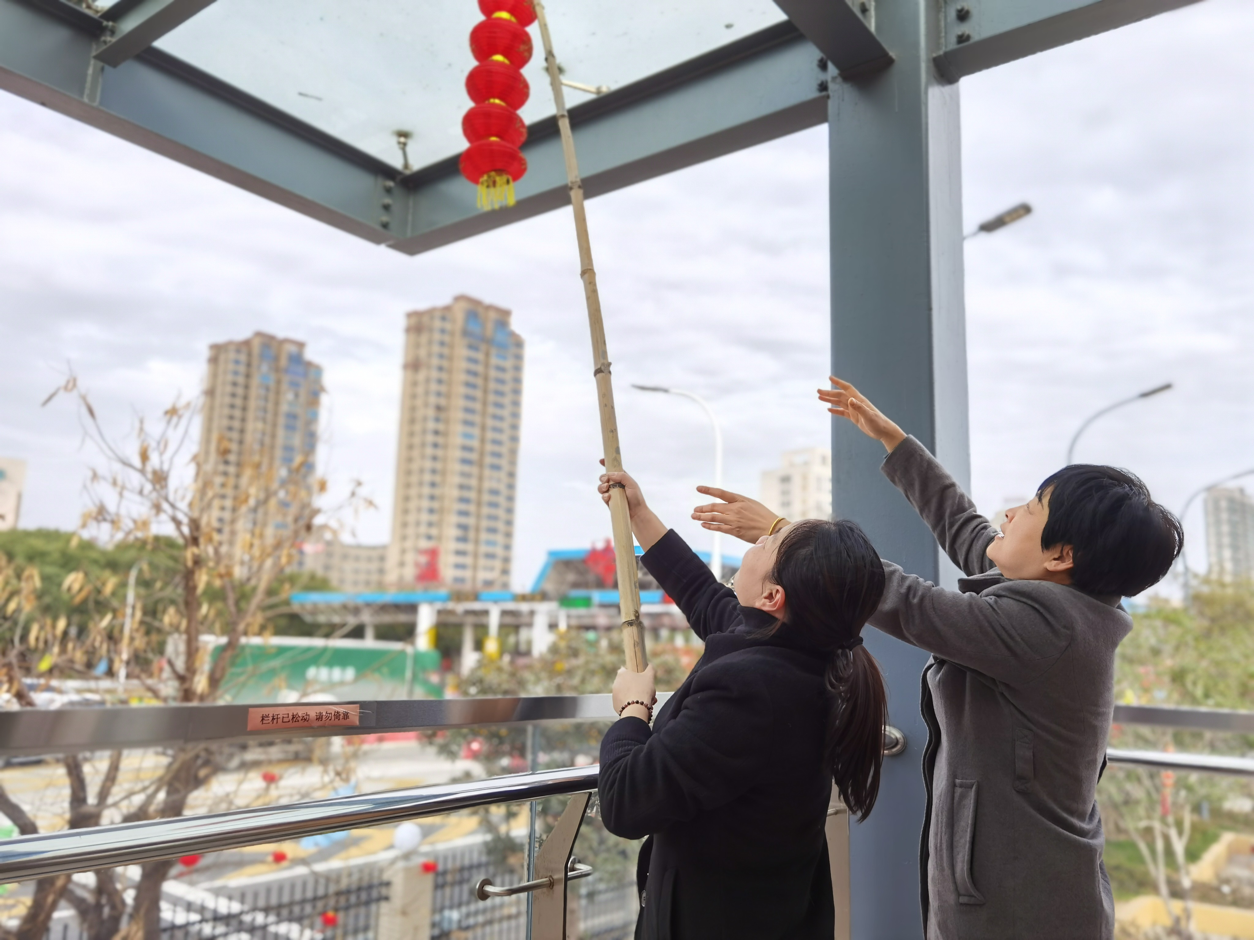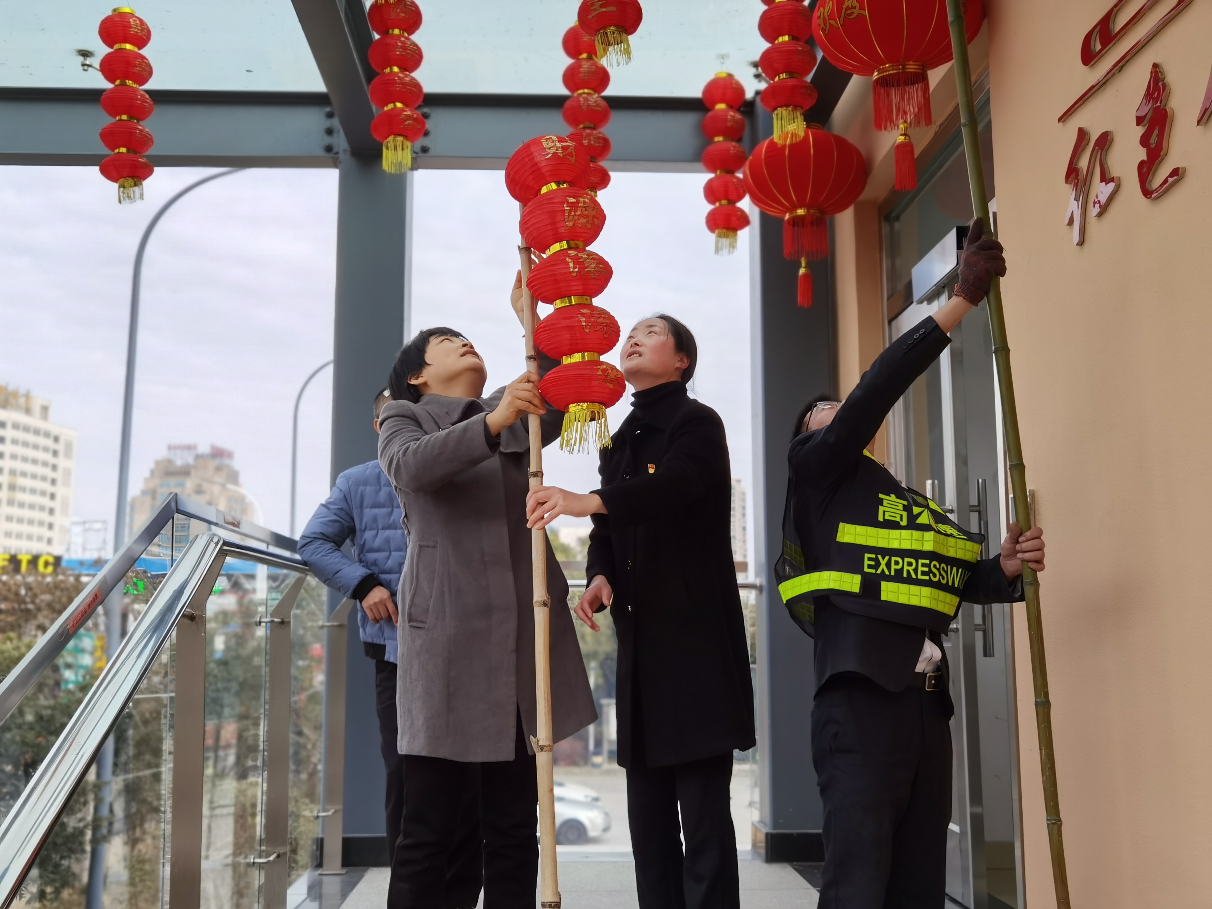 大家分工合作,搬梯子、遞春聯(lián)、貼膠帶、校正高低。在站所內(nèi)每個(gè)角落都掛上了紅彤彤的燈籠;收費(fèi)區(qū)域內(nèi)廣場兩邊的欄桿上扎著一面面彩旗。一幅幅精致喜慶的對(duì)聯(lián)、“福”字,一串串三角彩旗,一個(gè)個(gè)大紅燈籠把整個(gè)收費(fèi)站所點(diǎn)綴得處處洋溢著濃厚的節(jié)日氛圍,“年味”十足,讓在站員工和過往司乘朋友感受到新年的喜慶氛圍和“家”的溫暖。