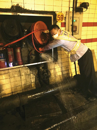 執(zhí)勤隊(duì)員們有序分工,紛紛帶上工具,開始檢修消防設(shè)備、清洗隧道內(nèi)攝像頭、維修陳舊的機(jī)電設(shè)備、拆換燈具等等,現(xiàn)場(chǎng)一派忙碌的景象。四公里長(zhǎng)的隧道內(nèi)有82個(gè)消防箱,每隔50米就有一個(gè),而里面空氣質(zhì)量很差,比霧霾嚴(yán)重?cái)?shù)百倍,僅一只口罩根本凈化不了廢氣,但由于時(shí)間緊,任務(wù)重,隊(duì)員們顧不上惡劣的環(huán)境,努力和時(shí)間賽跑,爭(zhēng)取高效完成任務(wù)。