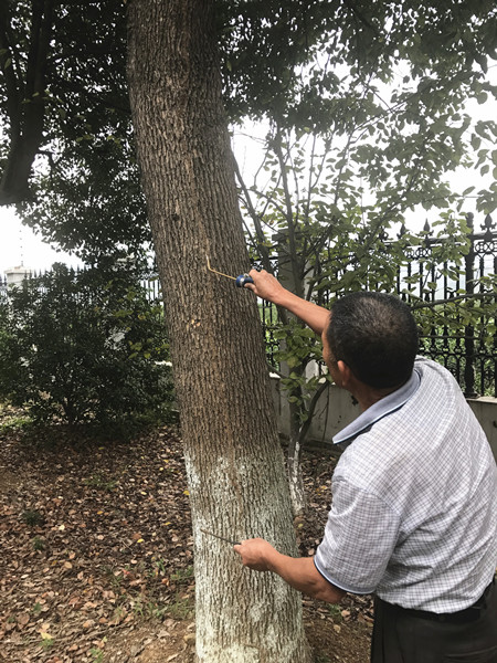 上圖為技術(shù)人員在防治白蟻受災(zāi)處 為全面消除隱患,該所立即組織人員對(duì)員工宿舍、綠化帶、辦公樓逐一進(jìn)行地毯式排查,最終發(fā)現(xiàn)三處地方受災(zāi)最為嚴(yán)重,同時(shí)在員工宿舍旁綠化帶處找到白蟻窩。該所負(fù)責(zé)人及時(shí)聯(lián)系建設(shè)局房管處白蟻防疫站技術(shù)人員,對(duì)樹(shù)木、門(mén)框等進(jìn)行防治消殺和用白粉涂擦等方式排除隱患,通過(guò)防治消殺和白粉涂擦等方式,有效確保了所內(nèi)環(huán)境的生態(tài)資源健康和安全。
