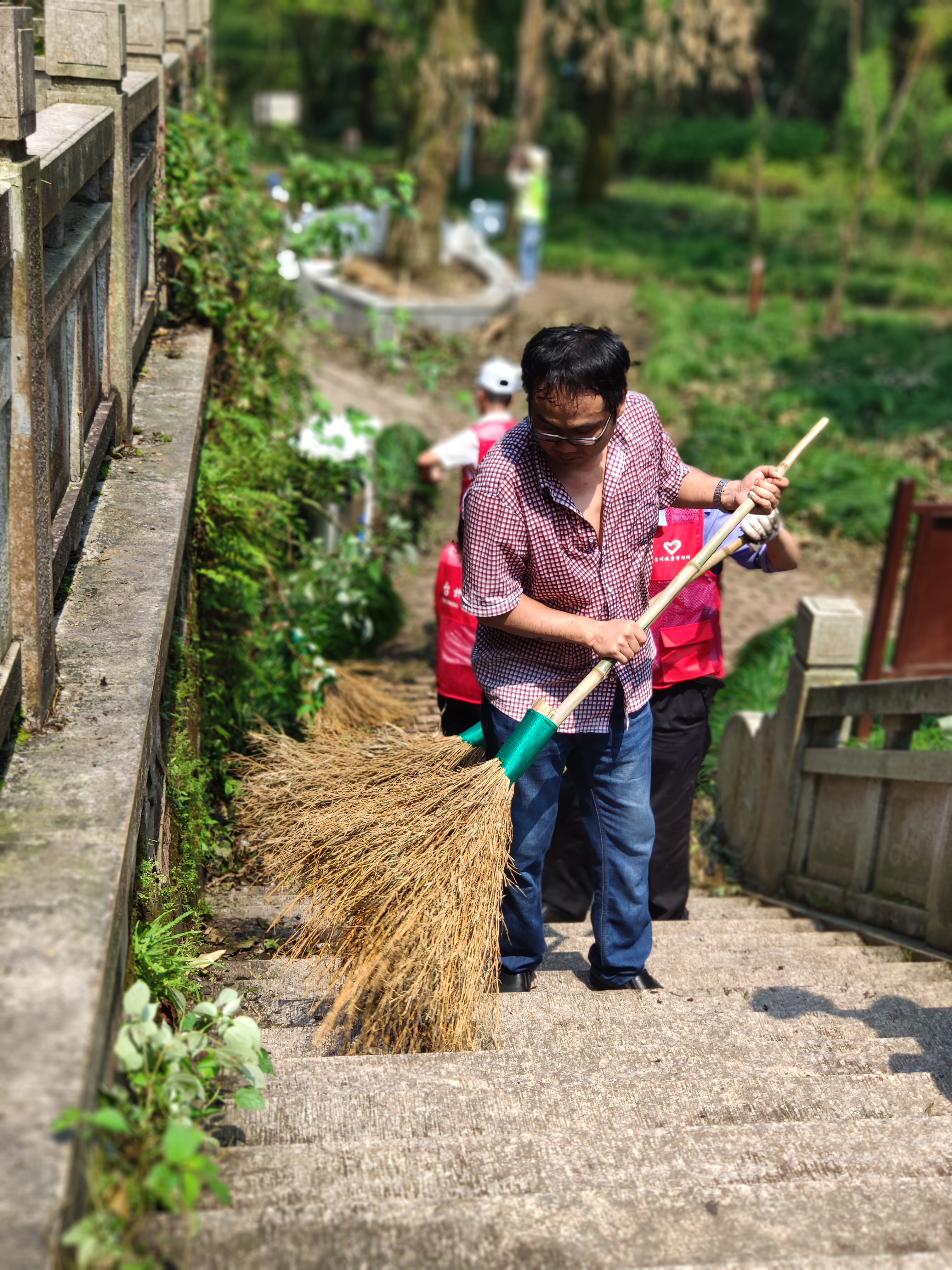 圖為打掃現(xiàn)場(chǎng) 上午8點(diǎn)半左右,志愿者們帶著掃把、鐵鍬等工具到達(dá)九峰公園,在黃巖青年志愿者的帶領(lǐng)下,來到劃分的平臺(tái)區(qū)塊。受9號(hào)臺(tái)風(fēng)“利奇馬”影響,公園內(nèi)不少樹木倒地,枯葉遍地。志愿者們帶著手套,用掃把、鐵鍬將平臺(tái)區(qū)域內(nèi)堆積的落葉和樹枝進(jìn)行裝袋清理。小的樹枝用草繩捆扎;拿不動(dòng)的樹枝,用鋸子鋸斷了抬走;鐵鍬不好裝袋,就用手去捧。烈日酷暑下,志愿者們不顧汗流浹背,經(jīng)過兩個(gè)多小時(shí)的努力,共清理出40多袋垃圾,大家用雙手還公園一片美。