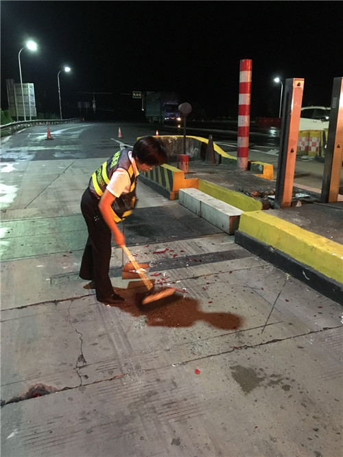 為了保暢通,收費(fèi)班長(zhǎng)讓司機(jī)拍照后開(kāi)到外面等待處理,車(chē)輛駛離車(chē)道后,發(fā)現(xiàn)稱(chēng)臺(tái)上罩殼跟防護(hù)欄被擠彎,地上剩下一堆玻璃碎片殘?jiān)0嚅L(zhǎng)正在處理相關(guān)事宜時(shí),發(fā)現(xiàn)收費(fèi)員張小芬已經(jīng)麻利的在車(chē)道上清理殘余碎片,不多久就恢復(fù)了超寬車(chē)道通行。