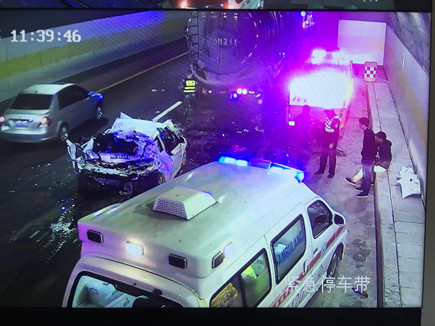圖為事故現(xiàn)場 情況緊急,一接到指令,巡邏車立即在南廣場調(diào)頭,趕赴事故現(xiàn)場。而此時較大的車流量已造成后方堵車,導(dǎo)致巡邏車被堵在隧道口,執(zhí)勤隊員怕時間耽擱太久,便火速跑到事故現(xiàn)場,第一時間將車?yán)锏娜藛T救出。所幸轎車內(nèi)四人只有一人腳上受傷,中控立即拔打120急救電話。在他們還在施救的時候,追尾事故卻頻頻發(fā)生,500米左右、1300米左右的超車道上先后發(fā)生兩小車、三車追尾事故,隧道內(nèi)排起了長龍。為了保證在最短時間內(nèi)恢復(fù)正常通行,執(zhí)勤隊員忙著奔赴現(xiàn)場指揮預(yù)警,應(yīng)急救援有序展開。  現(xiàn)場,監(jiān)控中心、交警、執(zhí)勤隊等部門分工協(xié)作,整個施救過程一直持續(xù)到中午12點多才順利完成。盡管執(zhí)勤隊員到現(xiàn)在都滴水未進,但每個人臉上繃緊的神經(jīng)終于都得到了放松。  林玲 |