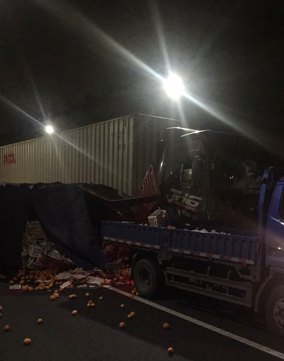 圖為事故現(xiàn)場 得知此情況,所負(fù)責(zé)人第一時間趕赴事故現(xiàn)場。事故就是命令!救援隊伍立即兵分三組,一組由駕駛員林通用巡邏車送傷者至臺州收費所出口,與前來救援的120救護(hù)車進(jìn)行對接,一組由金志輝、宋勤滿在寧向南洞口卡口,一組由李海福所長、應(yīng)錦清副所長在現(xiàn)場協(xié)調(diào)指揮,同時配合交警維護(hù)通行秩序,與交警一起對事故現(xiàn)場展開救援。 經(jīng)了解,由于藍(lán)色貨車超車道緩慢行駛,集裝箱與貨車發(fā)生車輛剮蹭追尾導(dǎo)致后方送桔貨車側(cè)翻。貨車上的桔子多半散落,給清障帶來一定的難度,管理所負(fù)責(zé)人、高速交警、清障人員、養(yǎng)護(hù)人員共同當(dāng)起了“指揮員”、“搬運工”,全力清理事故現(xiàn)場。 16時36分,由于處理及時,措施得當(dāng),事故未造成大面積擁堵,道路恢復(fù)正常通行。                                             林玲