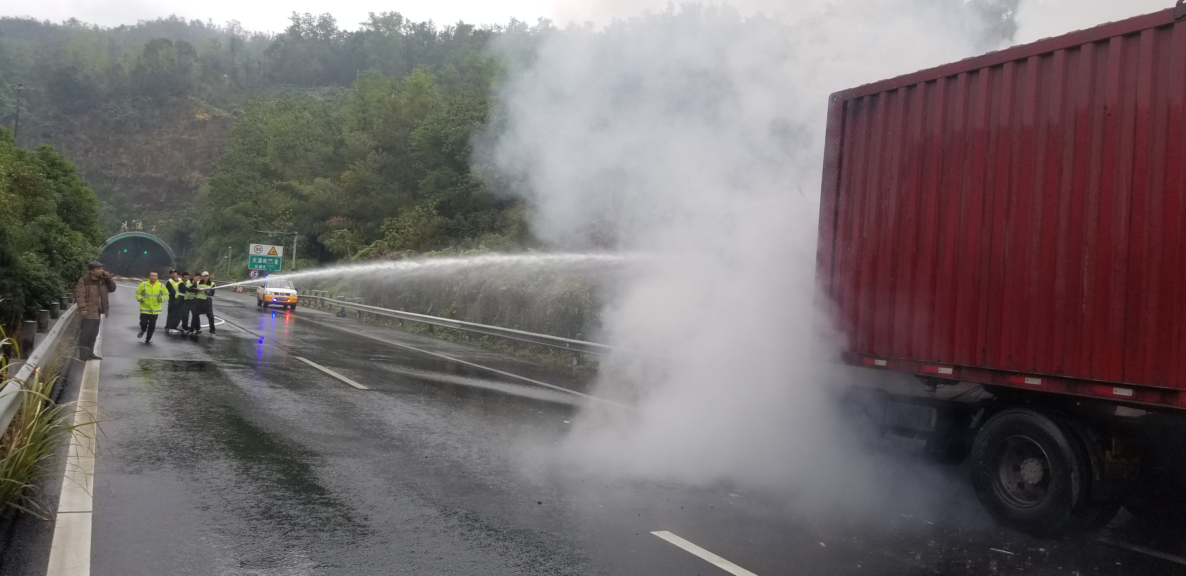 隧道外突發(fā)火情,執(zhí)勤隊(duì)火速救援   11月23日上午09:15分,一陣急促的警鈴聲響起,大溪嶺北情報(bào)板附近硬路肩有一集裝箱貨車車頭起火,執(zhí)勤三隊(duì)隊(duì)長(zhǎng)剛好在中控室,迅速組織執(zhí)勤隊(duì)員趕往現(xiàn)場(chǎng)。