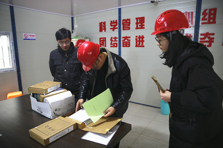 圖為檢查人員在文鼎苑項(xiàng)目部檢查內(nèi)業(yè)資料