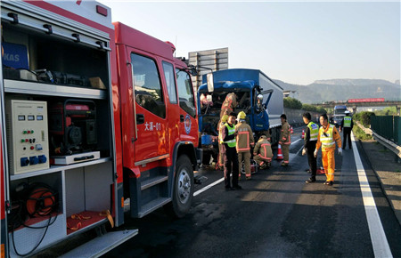 4月19日上午6點10分,寧向大溪出口正在進行分流,所有車輛正緩慢前行中,一輛贛F38***牌照的藍色大貨車顯然還沒有適應這分流的節(jié)奏,“砰”地一聲猛然撞上了前面的大貨車。 兩個“大家伙”碰撞的威力非同小可,直接的后果就是后車的車頭變形,損傷極大,貨車駕駛員被卡在車頭里出不來。 時間就是生命,施救中心迅速出動,配合交警、消防部門在現場進行預警,并協(xié)助進行事故處理。