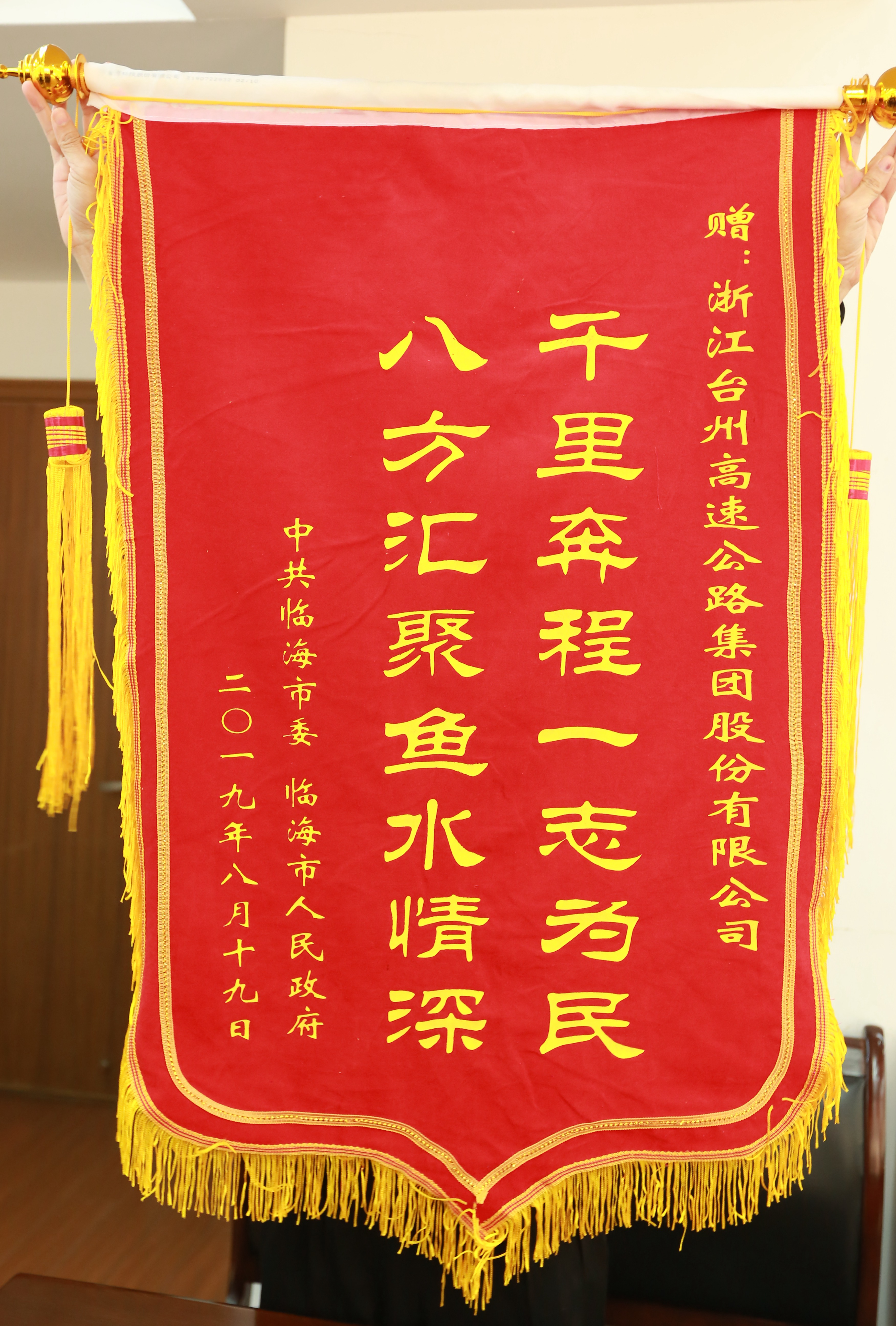 【洪水無情人有情】臨海市給臺(tái)州高速集團(tuán) 送來錦旗和感謝信 今天下午,臨海市市長王丹代表臨海市委、市政府向臺(tái)州高速集團(tuán)送來了錦旗和感謝信,感謝在防御第9號(hào)臺(tái)風(fēng)“利奇馬”及災(zāi)后重建過程中,臺(tái)州高速集團(tuán)給予的大力支援。
