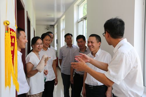 圖為集團總經(jīng)理張建平在文明寢室流動紅旗前暢談