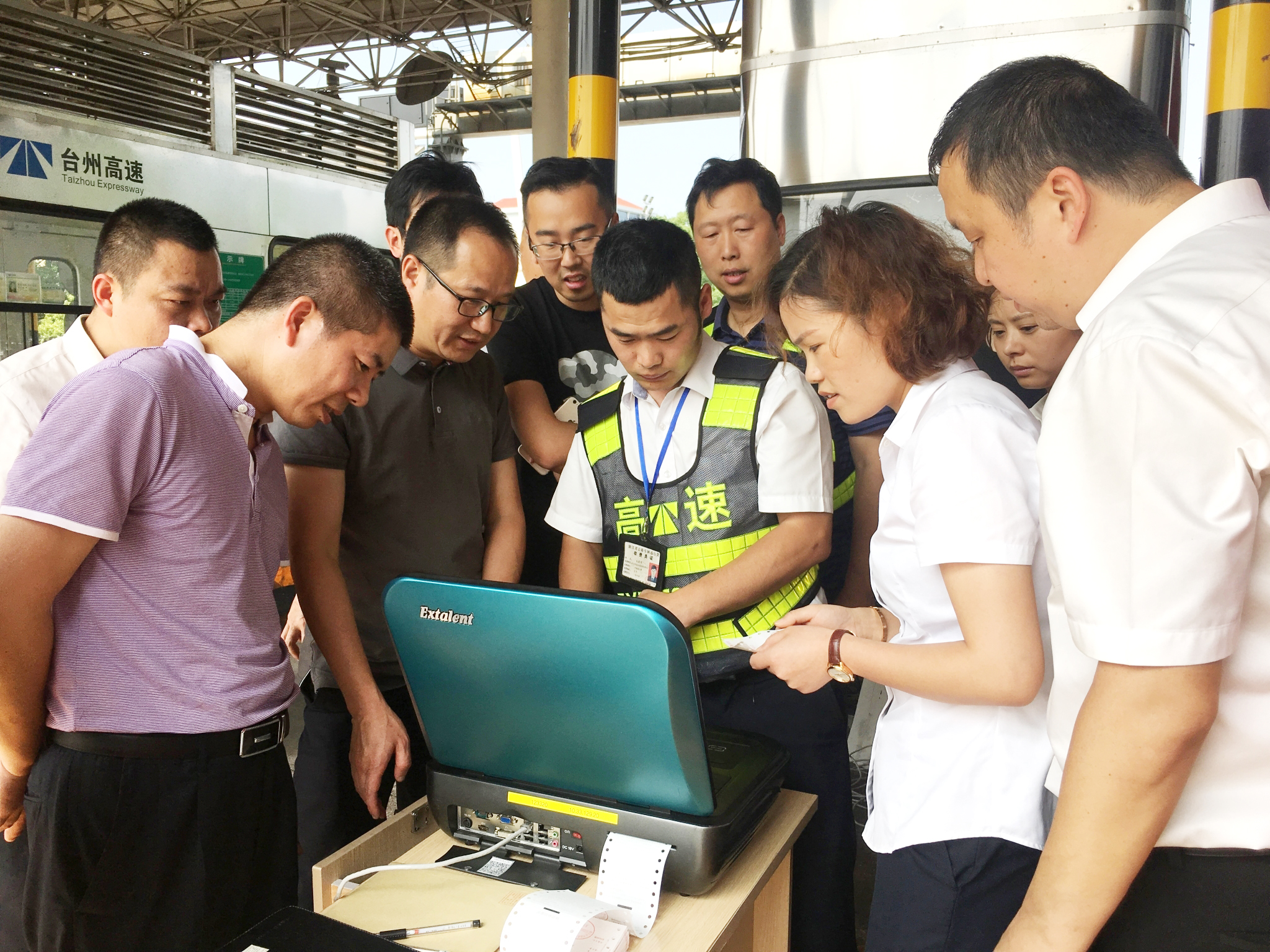 圖為臺(tái)州南收費(fèi)所人員學(xué)習(xí)使用便攜式收費(fèi)機(jī),公司副總經(jīng)理章海峰到場(chǎng)指導(dǎo)