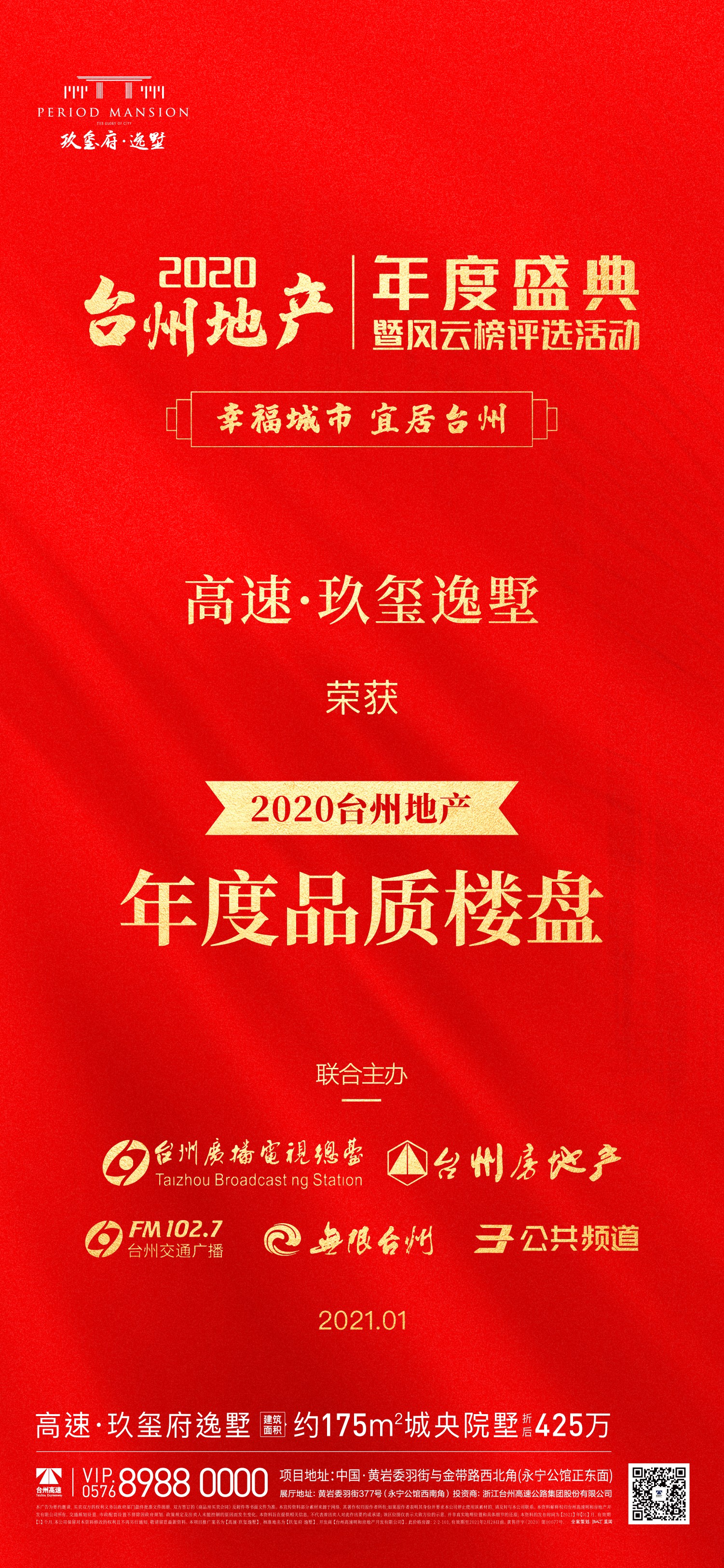 2021年1月19日下午,由臺州廣播電影電視集團聯(lián)合臺州市房地產(chǎn)業(yè)協(xié)會共同舉辦的2020臺州地產(chǎn)年度盛典暨臺州地產(chǎn)風云榜,在全城熱矚下重磅舉行。高速房產(chǎn)玖璽府·逸墅項目榮獲“2020臺州地產(chǎn)年度品質樓盤”榮譽稱號。