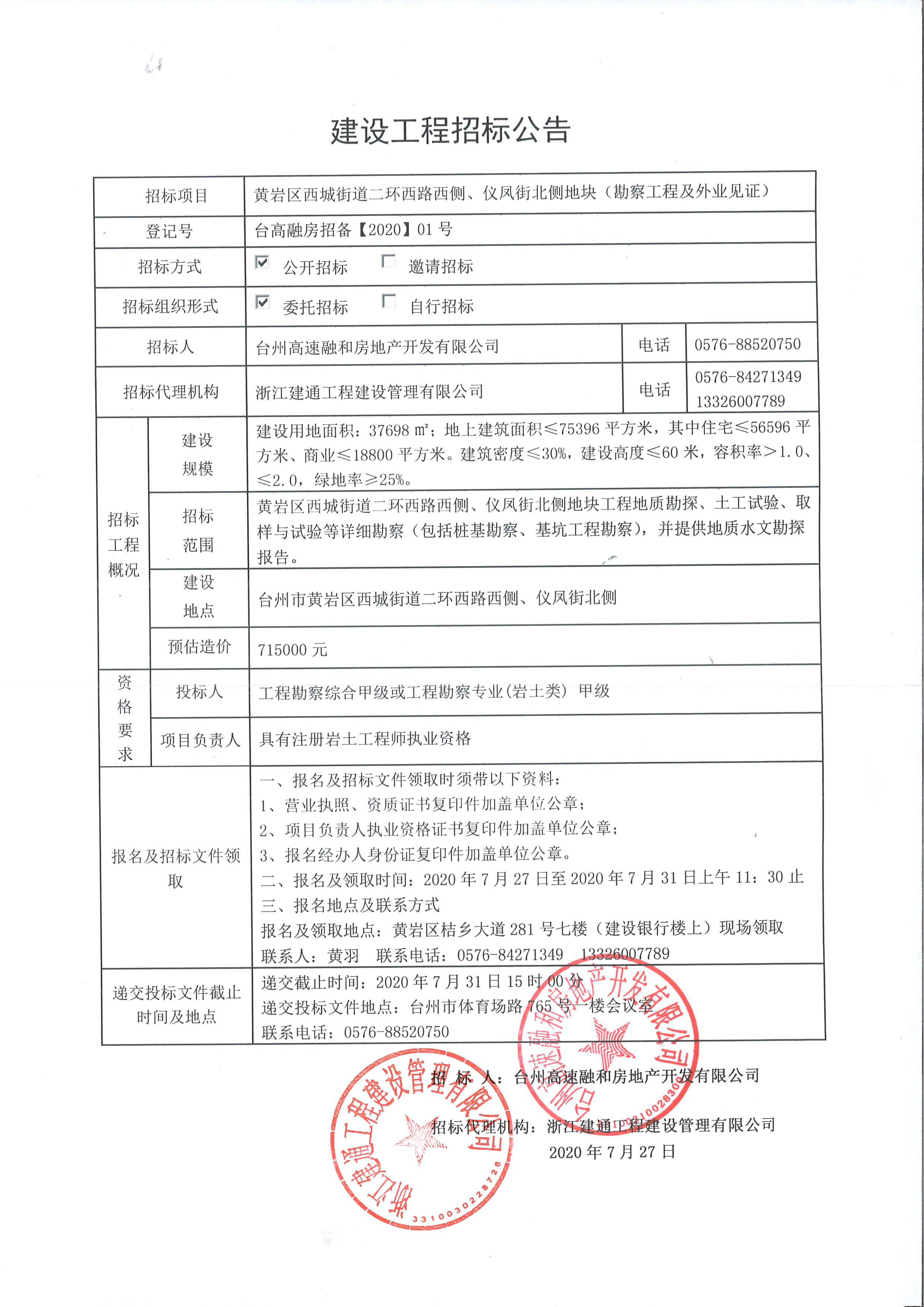 黃巖區(qū)西城街道二環(huán)西路西側(cè)、儀鳳街北側(cè)地塊(勘察工程及外業(yè)見證)建設(shè)工程招標公告