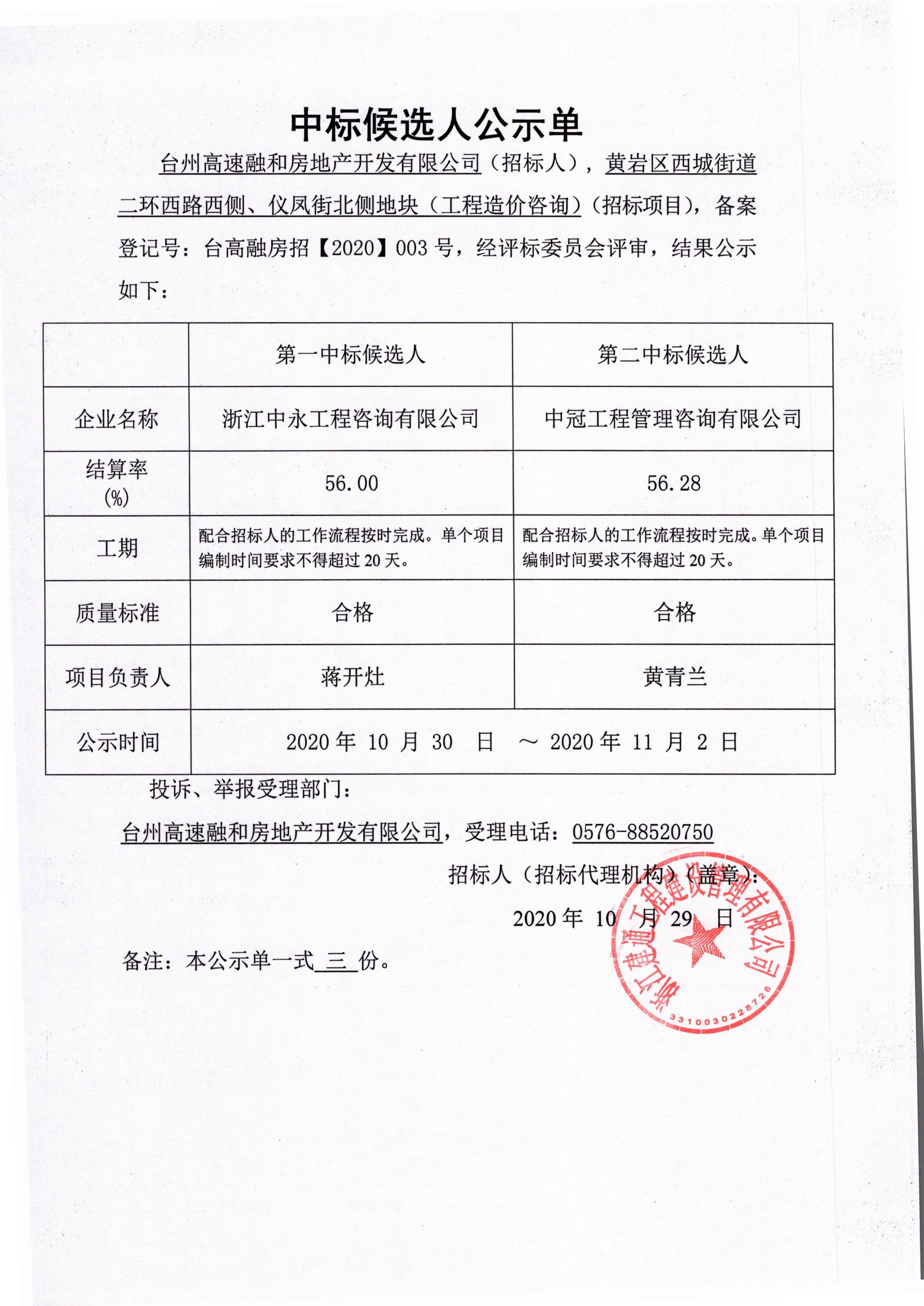 黃巖區(qū)西城街道二環(huán)西路西側(cè)、儀鳳街北側(cè)地塊(工程造價咨詢)中標候選人公示單