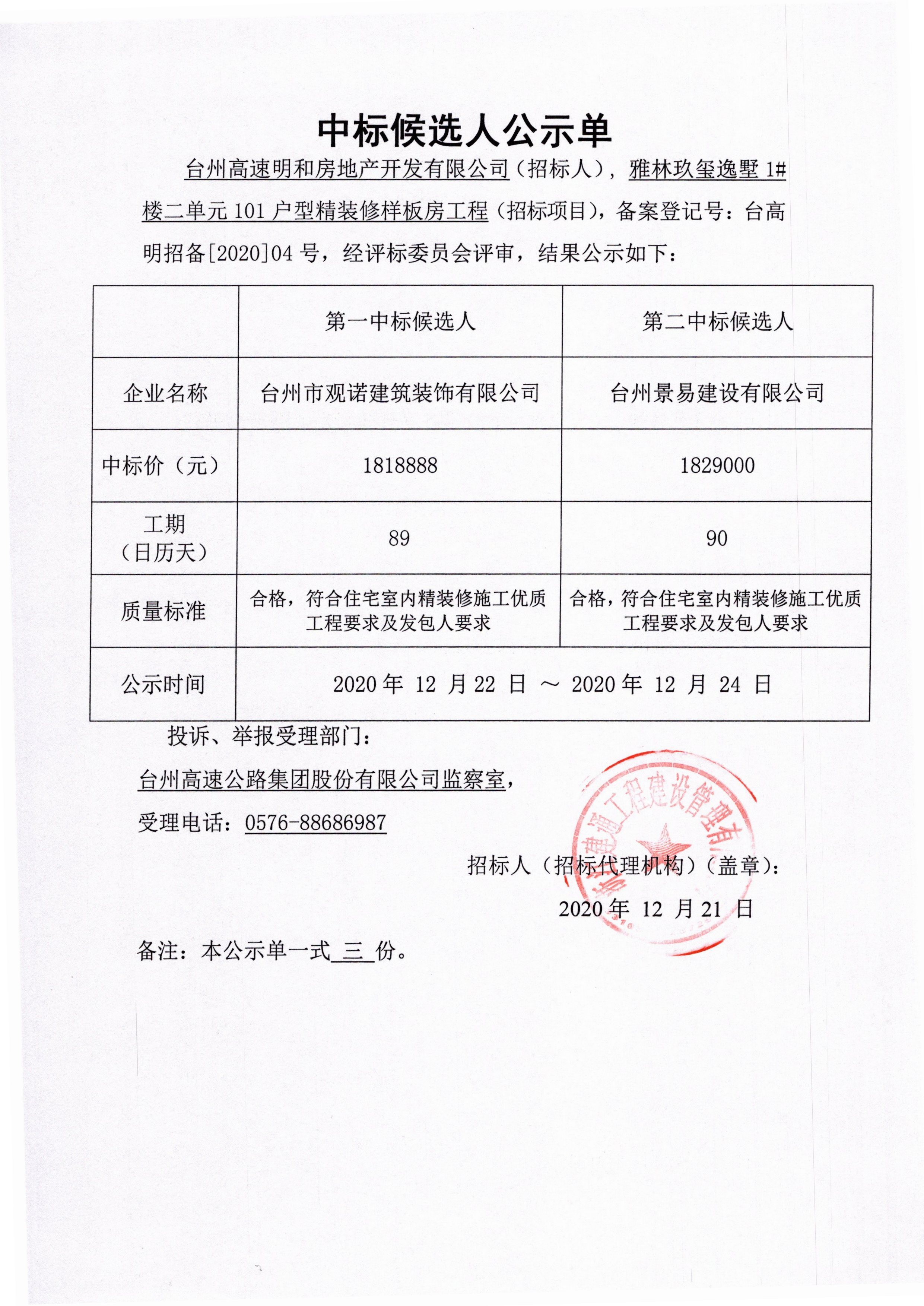 雅林玖璽逸墅1#樓二單元101戶型精裝修樣板房工程中標(biāo)候選人公示單