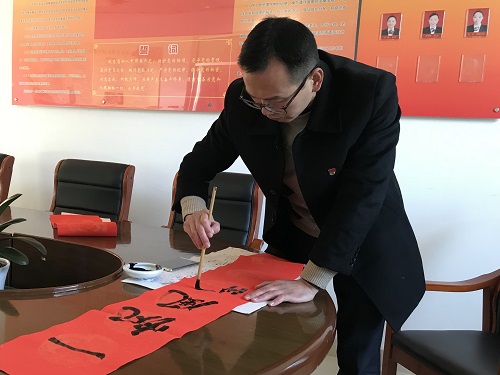 上聯(lián)“自強不息吉慶到”、下聯(lián)“厚德載物福運來”,橫批“喜迎新春”,個個遒勁有力的大字從筆尖輕快地躍出,行云流水的書法讓在場人員無不拍手叫好。所長孫明偉亮出絕活,揮毫潑墨,豪邁大氣地揮寫著一幅幅春聯(lián)。