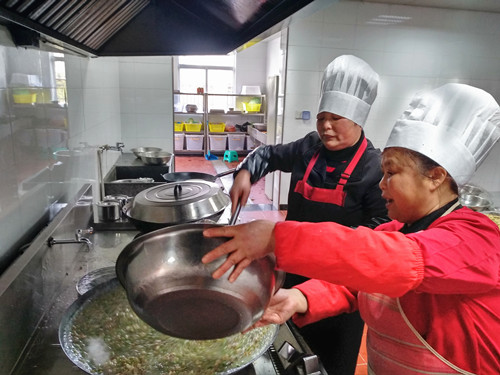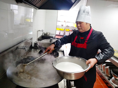 浸了一夜的早米,用石磨磨成米漿,細(xì)膩而幼滑,被靜置在盆里。“一般都用米粉泡水,口感粗糙,而且吃起來沒有香頭。”利花一邊說,一邊將香腸切碎與豆腐、冬筍、胡蘿卜、芹菜、香菇、蠶豆瓣翻炒著。旁邊的大鍋里,長(zhǎng)長(zhǎng)的豆面在骨頭湯里翻滾著,像一棵棵舞蹈的海草。徐徐倒入的米漿,被不停地?cái)嚢瑁耙钦车藉仯蜁?huì)有焦糊味,這鍋羹就算廢了。”米漿好像不夠,利花有些懊惱,“要是在家里,米漿都會(huì)多準(zhǔn)備一些,不夠就隨手添,我?guī)У竭@里就這些,也沒得加了。”就叫在一邊做幫手的妹妹寶花用面粉和山粉(也就是番薯粉)摻水拌起來,倒入鍋里,湯漸漸濃稠起來,倒入之前炒好的配料,加上切得細(xì)細(xì)的綠綠的芥菜梗、芥菜葉、海蠣,鍋里不時(shí)冒起大泡,香氣四溢。 為照顧吃不慣糟羹的同事,食堂還準(zhǔn)備了一鍋甜的山粉糊。來自臺(tái)州各縣市區(qū)的同事,按各自飲食習(xí)慣選擇了咸的或甜的。有說芹菜的味道蓋過了芥菜清香的,有說沒有加入芋頭口感不夠糊的,但撲鼻的香氣和濃厚豐富的口感立刻讓人忘了挑剔。對(duì)我來說,碧綠的芥菜葉和白胖的海蠣肉是整碗羹的顏值擔(dān)當(dāng)和靈魂所在。 每個(gè)元宵節(jié),對(duì)于在崗的同事們是沒有花燈可看、沒有燈謎可猜的,也不能與家人聚在一起吃羹。車道上此刻正是流量高峰期,大家匆匆吃完,都要趕著上崗。食堂大姐把多出的糟羹和山粉糊放進(jìn)蒸飯鍋保溫,叮囑大家下班后再來吃點(diǎn),這個(gè)吃了不扛餓。此時(shí),除了食物最能體現(xiàn)節(jié)日氣氛外,還有那一份特意為你留著的溫?zé)岣屓烁袆?dòng)。 鄭瑛芝