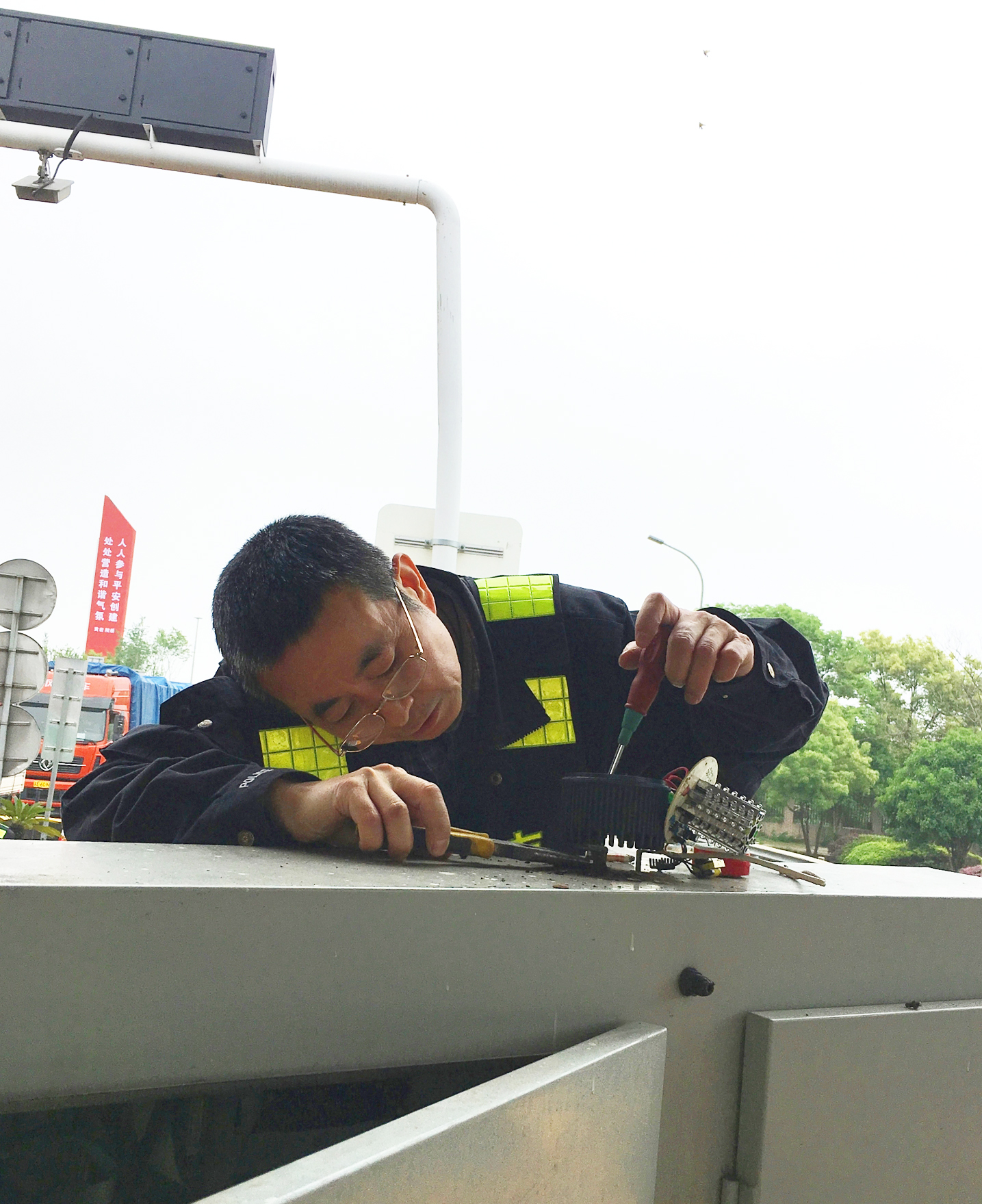 歲月滄桑,時光荏苒,如今張鵬兩鬢已顯斑白,眼睛也有些老花,但依然精神抖擻,干勁十足。8月12日,臺風過后的臺州南收費所內(nèi)廣場有兩盞路燈同時失效。當?shù)歉哕囘^來的時候,盡管當時他因痛風雙腳腫大還沒完全消退,但仍第一個跳上去維修,站在狹小車兜里佝僂著身子,戴著老花鏡更換各種設備。8月的烈日炎炎似火燒,沒過一會豆大的汗珠從他額頭上淌下透濕了全身。